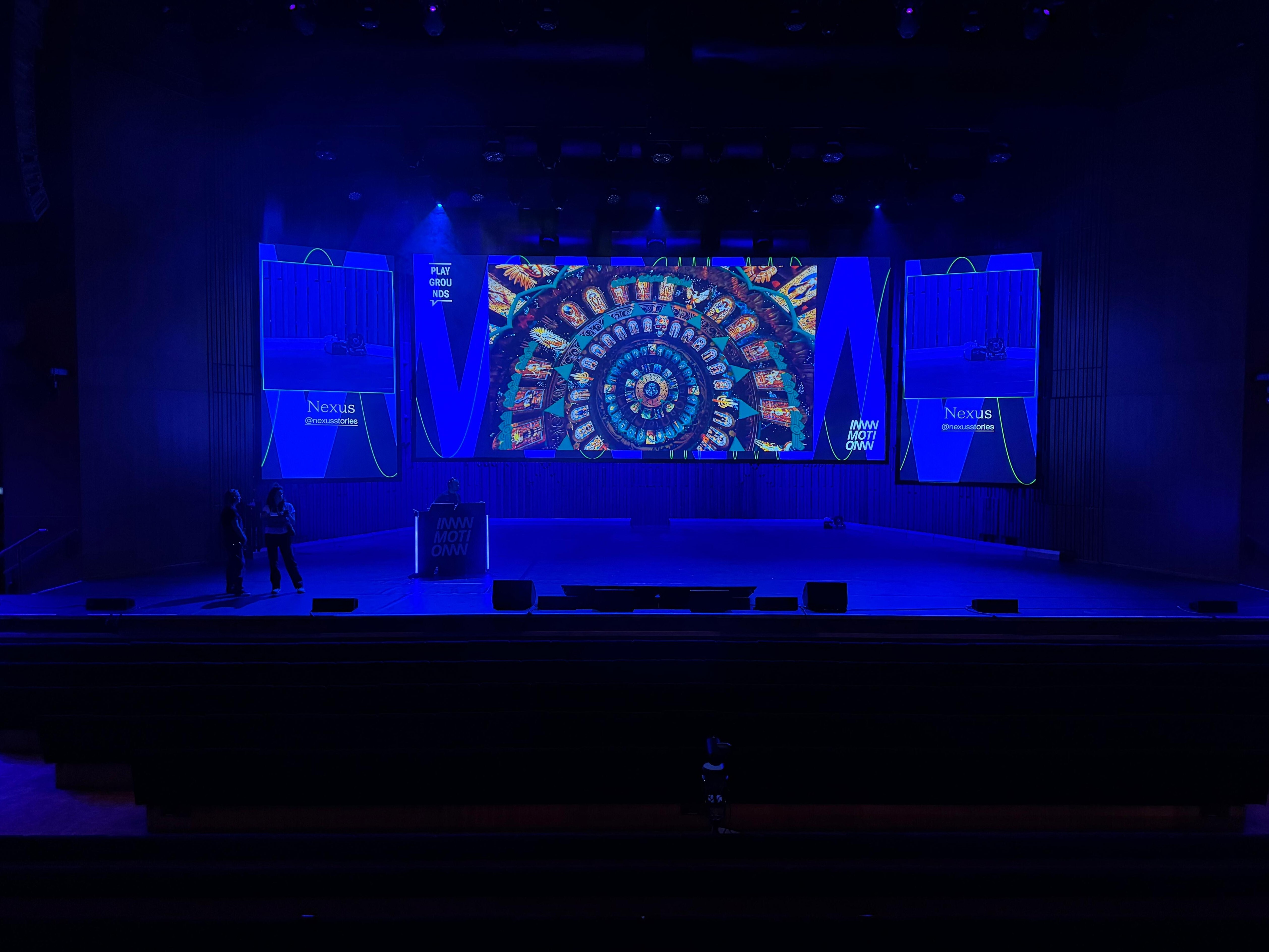 In opdracht van de organisatie van We Are Playgrounds verzorgde Bazelmans AV de volledige AV-ondersteuning. Het hart van de zaal werd gevormd door een indrukwekkende projectie van 10 meter breed bij 4,6 meter hoog, gerealiseerd met de Panasonic RQ35 laserprojector. Aan weerszijden zorgen twee extra projecties van 2,9 bij 5 meter, aangedreven door Panasonic RQ25 projectoren, voor een visuele diepte.