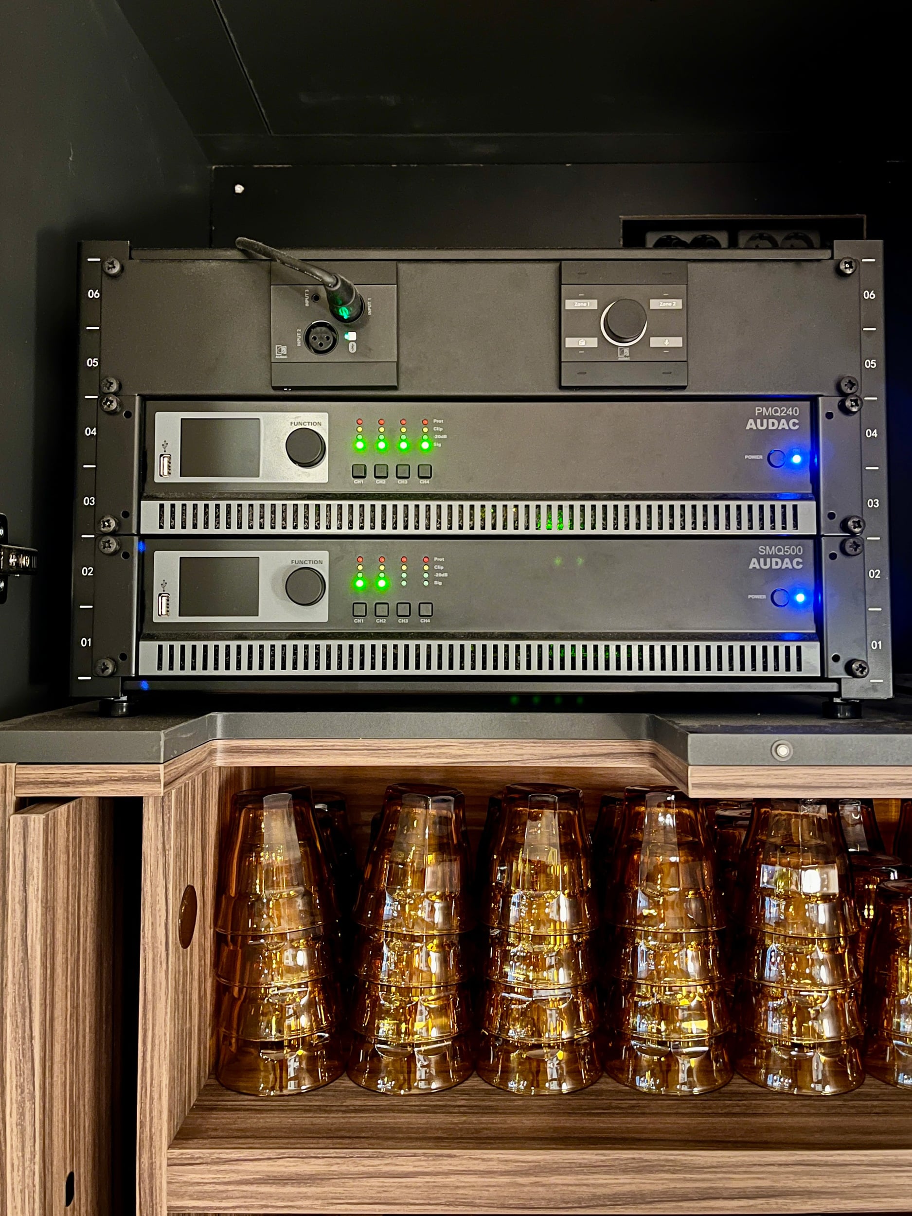 Voor de invulling kozen we voor een doordachte AUDAC-configuratie. Plafondspeakers uit de CIRA824-serie zorgen voor een gelijkmatige en warme geluidsverdeling door het gehele restaurant. Daarnaast zijn er bij het podium twee VIRO5 speakers en een subwoofer gepositioneerd, voor een krachtige beleving tijdens liveoptredens.